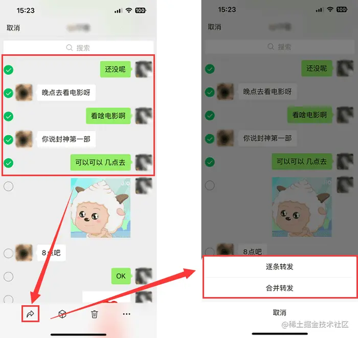 第2步:选中后点击【转发】,然后再根据自己喜好选择【逐条转发】或者【合并转发】。小编建议选择【合并转发】,更加简单快捷,最重要的是能够清晰明了地展示上下文的关系。