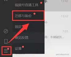 第1步:在电脑上点击微信的【设置】图标,在弹出菜单栏中选择【迁移与备份】。