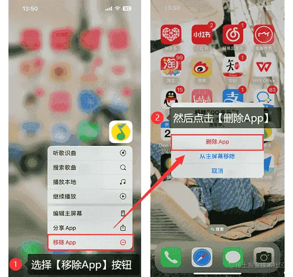 第2步:点击【移除App】,然后一定要选择【删除App】将软件删除。【从主屏幕移除】只是将软件单纯地移除出主屏幕,是无法起到删除软件的效果的。