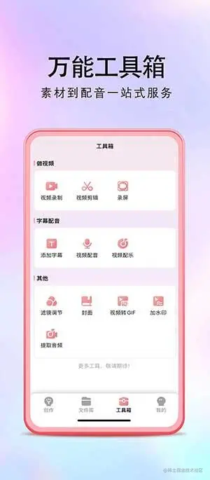 配置视频录制、录屏、字幕配音等功能, 从素材到创作一站式服务,告别“一次创作,多种软件混用时代”。