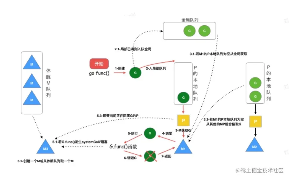 - M:线程想运行任务就得获取P,从P的本地队列获取G,P队列为空时,M也会尝试从全局队列拿一批G放到P的本地队列,或从其他P的本地队列偷一半放到自己P的本地队列。M运行G,G执行之后,M会从P获取下一个G,不断重复下去。