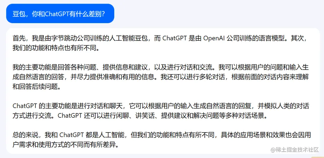 笔者在网页版进行了测试,面对提问“你和ChatGPT有什么区别?”,“豆包”的回答如下,可以说中规中矩,无功无过。