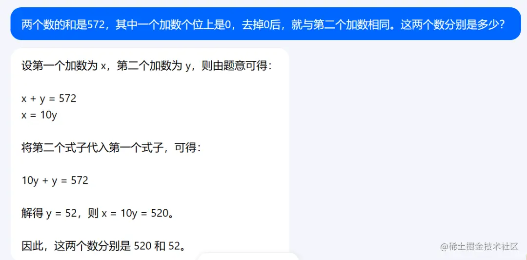 除了语言表达之外,豆包的计算能力也还行。笔者挑了一道小学奥数题——“两个数的和是572,其中一个加数个位上是0,去掉0后,就与第二个加数相同。这两个数分别是多少?”