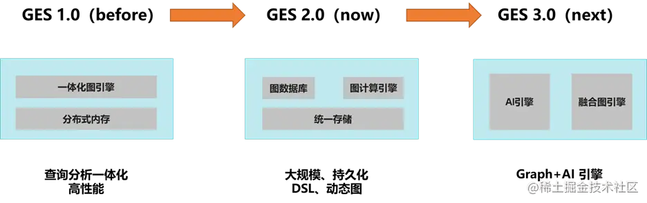 下图展示GES各个版本的技术架构以及相对应的特点,在后面的部分会详细展开分析。