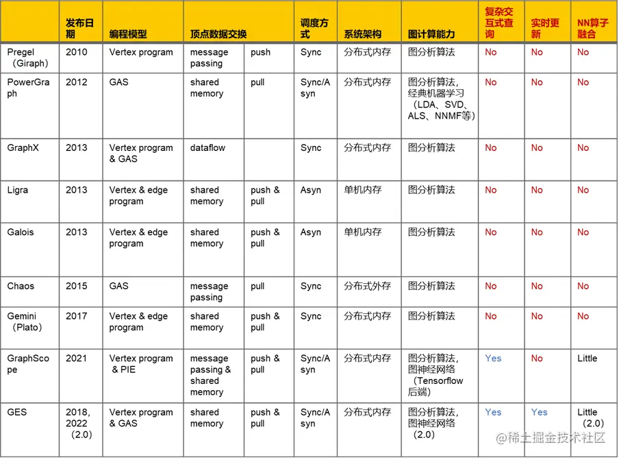上表列举了主流图分析、图学习系统的分析情况,我们的观点是: