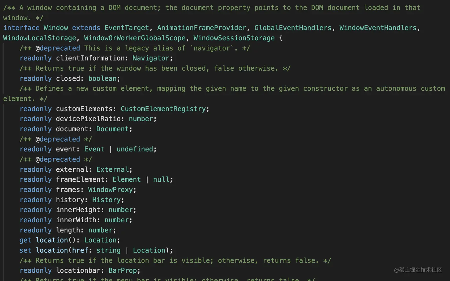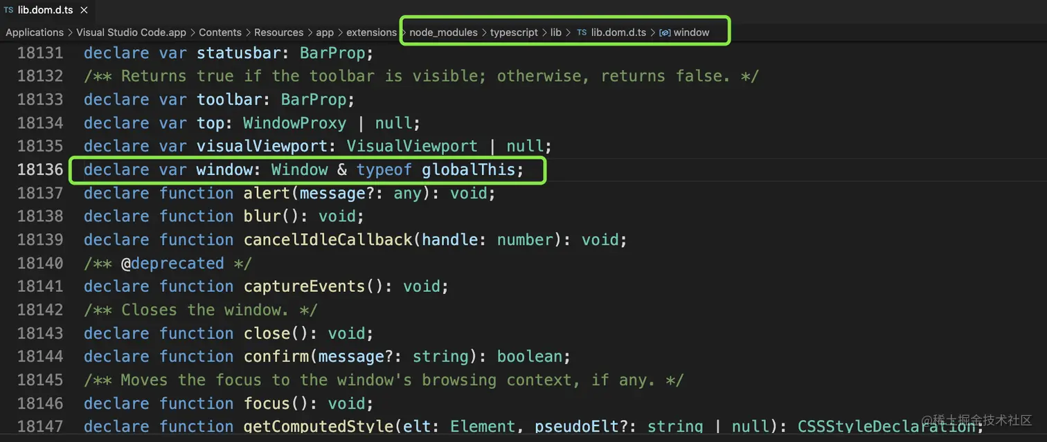 除了直接声明全局变量, 我们还能在现有的WIndow类型基础上, 再多声明一个属性, 之所以说是再多声明一个属性, 是因为Window这个类型是Typescript本身就自带的, 它本身就自带了一堆属性声明, 其类型声明就在Typescript的lib.dom.d.ts文件之下: