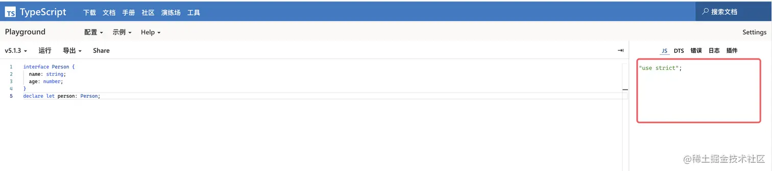 我们可以看到, declare出现在了.d.ts类型声明文件中, 我们知道浏览器能够运行的是Javascript代码, 所以, 我们写的Typescript代码必须被编译为.js! 但是如果我们希望编译后的代码仍具备类型推导, 则需要.d.ts文件, 做类型声明, 怎么做呢? 从以上声明文件的代码可以看出, 它用declare声明了一个person变量, 并且类型是Person类型; 而这个person其实就是指代index.js中的person变量! 它的作用就是告诉用户, index.js文件中的person,它是Person类型的! 因此, 我们可以得出结论: declare + 变量类型声明代码, 仅用于表达这个变量具备什么类型, 是纯类型层面的东西; 为什么说是纯类型层面的东西呢? 我们再把index.d.ts中的代码, 复制粘贴到index.ts中, 重新编译看看