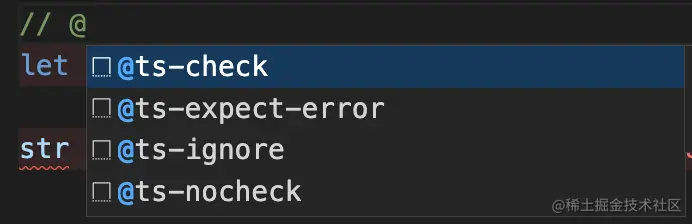 我们在Typescript实际开发中, 常常遇到一些由于Typescript无法推断或者其他一些未知问题导致的报错, 而我们同时也清楚这些问题不会影响项目的正常运行, 此时, 就可以使用类型指令来忽视掉这些报错, 所谓的类型指令, 其实就是行内注释; Typescript的行内注释统一用@ts-xx来表示, Typescript的类型指令总共有四个, 当我们在注释内写上@的时候, 就会自动提示出来: