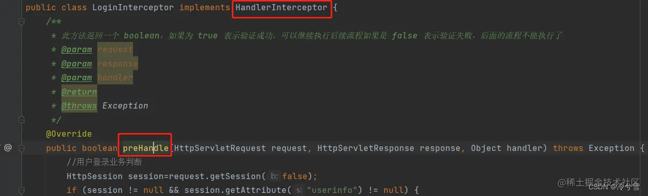 - 创建自定义拦截器,实现 HandlerInterceptor 接口的 preHandle(执行具体方法之前的预处理方法。