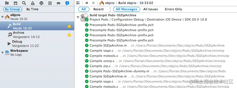 对于每一个目标,Xcode 都会经过一系列步骤,将源代码实际翻译成所选平台的机器可读二进制文件。让我们仔细看看第一个目标:SSZipArchive。