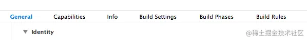 当您在 Xcode 5 中选择一个项目时,项目编辑器顶部会显示六个选项卡: 常规"、"能力"、"信息"、"构建设置"、"构建阶段 "和 "构建规则"。