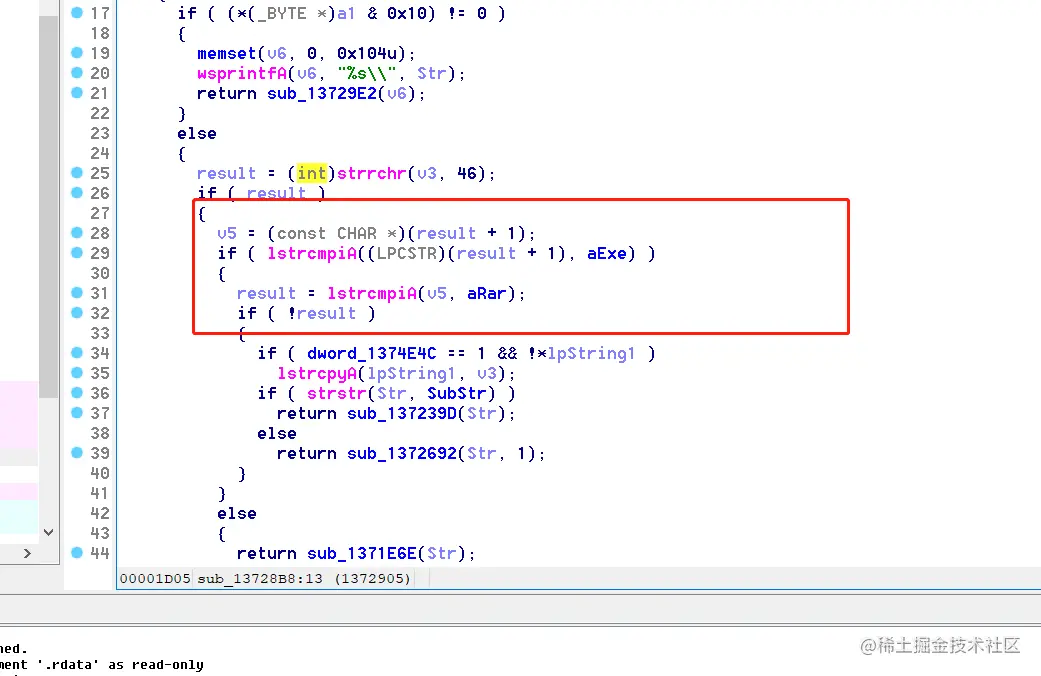 这里是筛选exe和rar后缀文件,进入sub_137239D函数: