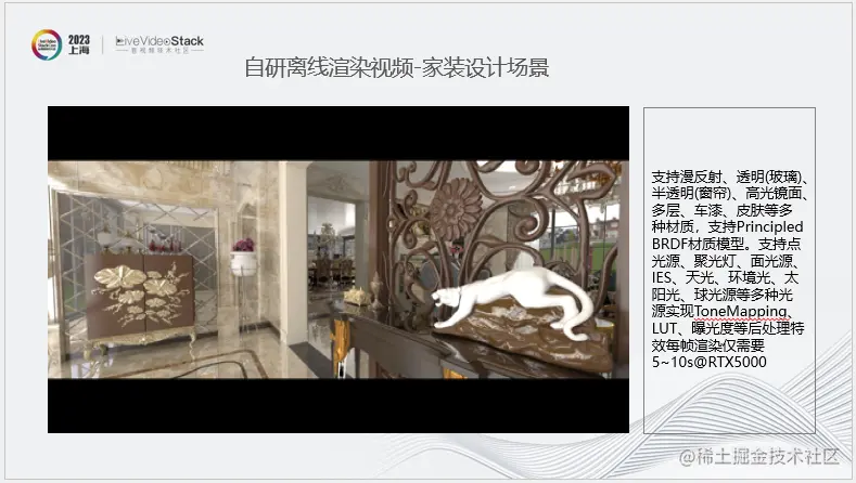 接下来对我们的自研离线渲染视频进行演示,它主要面向家装设计场景,光影真实性比实时渲染更强,每帧渲染仅需要5~10秒。