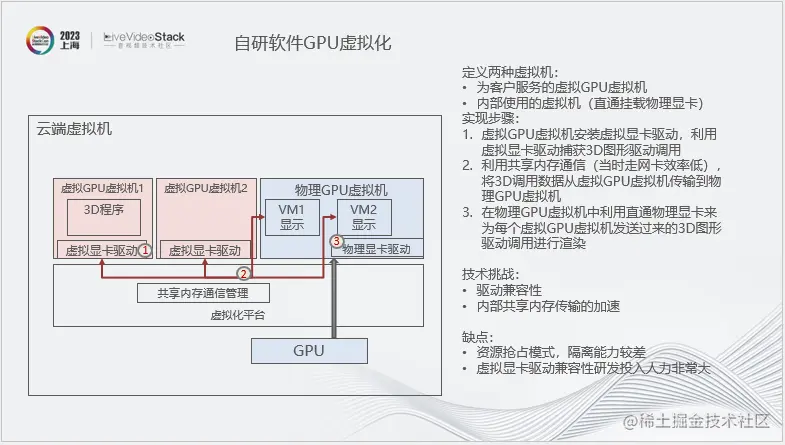 这种方式面临的挑战有两种,一是由于DirectX具有多种版本,驱动兼容实现难度大。二是内部共享内存传输还需进一步加速。存在的缺点是方案本身属于资源抢占模型,隔离能力较差,其次是对虚拟显卡驱动兼容性研发投入人力非常大。