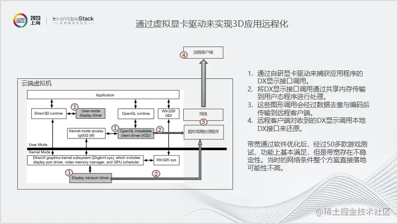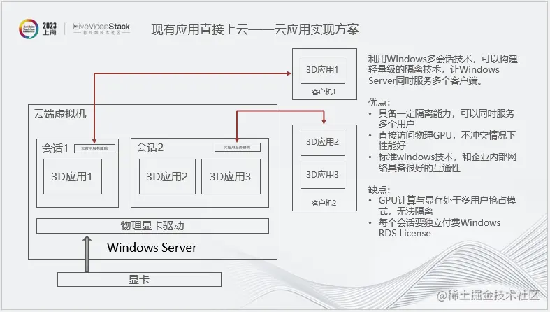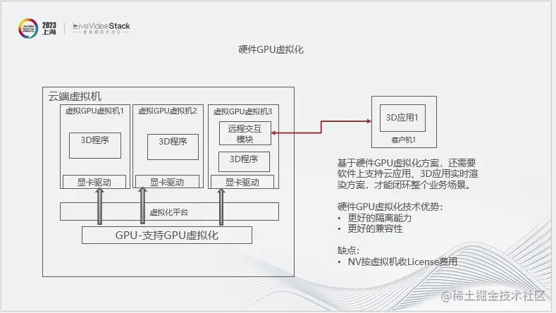 前面提到过的硬件GPU虚拟化也是一种主要的实现方式,但需要增加远程交互模块对3D应用进行管理。它的优势是隔离能力和兼容性好,缺点是Nvidia按照虚拟机单独收取License费用。