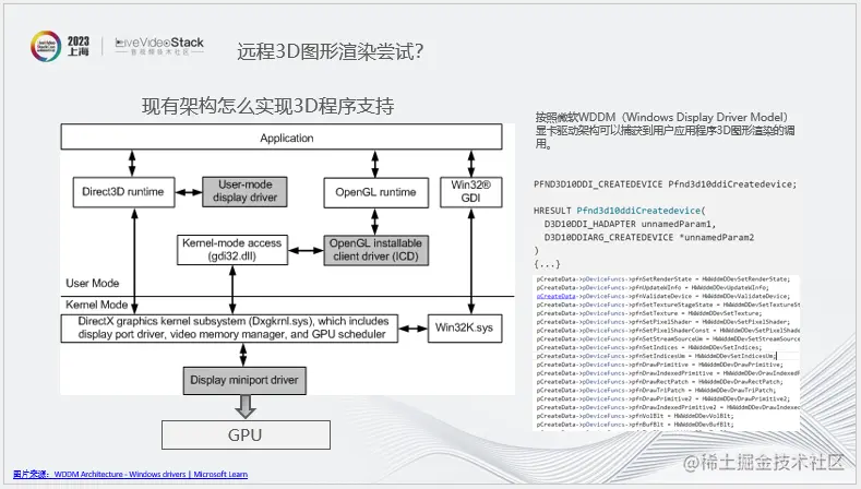按照微软WDDM显卡驱动可以捕获到用户应用程序3D图像渲染的调用。在该架构下,驱动程序分为用户态和内核态,实现3D程序需要借助Direct运行库,它调用设备厂商提供的驱动,并通过内核态驱动与GPU进行交互。OpenGL也存在类似程序。