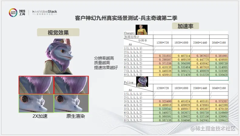 上图展示了一个AI加速渲染影视番剧的实际案例。可以看到毛发等细节与原生渲染图基本一致,并且质量要求越高,提速效果越好。