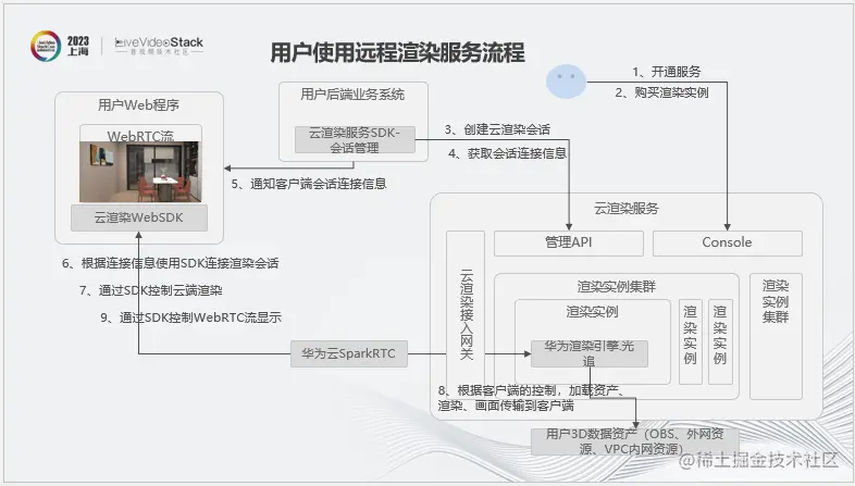 上图展示了用户使用远程渲染服务的具体流程。在开通服务并创建云渲染会话后,由远程SDK控制云端渲染,渲染后的画面通过华为RTC服务回传至客户端进行显示。