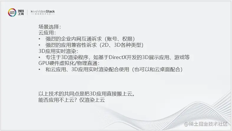 接下来对几种方案适用的场景进行介绍。选择云应用方案一般涉及强烈的企业内网互通(账号、权限)和应用兼容性诉求(2D、3D各种类型);选择3D应用实时渲染一般专注于3D渲染程序,如基于DirectX开发的3D展示应用、游戏等;GPU硬件虚拟化/物理直通方案一般配合云应用和3D应用实时渲染使用。
