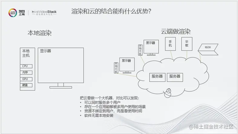 那么渲染和云结合的具体优势是什么?和消费级显卡相比,云数据中心使用的硬件价格十分昂贵,高昂的造价实际带来了哪些利好呢?如上图所示,如果将云看做一个大机器,可以发现,云渲染支持同时服务于不同类型(手机、平板、主机等等)的多个用户,并且可提供一个应用能够被多用户使用的场景。它的硬件资源不绑定到用户,而是由用户使用时间决定。软件也无需在本地进行安装。