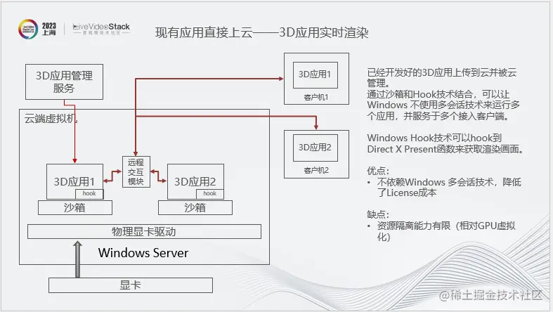 为了优化前面提到的License成本问题,我们通过将沙箱和Hook技术结合,让Windows不使用多会话技术运行多个应用,并服务于多个接入客户端,这也是目前云渲染的主流技术方案。它的优点是不依赖Windows多会话技术,降低了License成本,缺点是相对于GPU虚拟化,资源隔离能力有限。