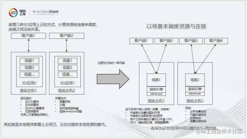 前面提到的几种3D应用上云方案本质上只是将本地程序部署上云,云仅仅提供本地资源的替代,计算资源按连接来调度,不同的应用间没有共享。