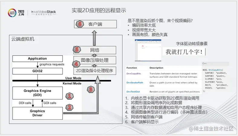 接下来介绍我们的云端2D实践。标准的2D图形显示流程如上图所示,首先由应用程序调用GUI程序库,GUI库转化为底层GDI运行库调用,此时运行库还处于用户态,没有调用硬件。随后GDI运行库调用显卡驱动,显卡驱动调用显卡,完成图像渲染并输出至显示器。