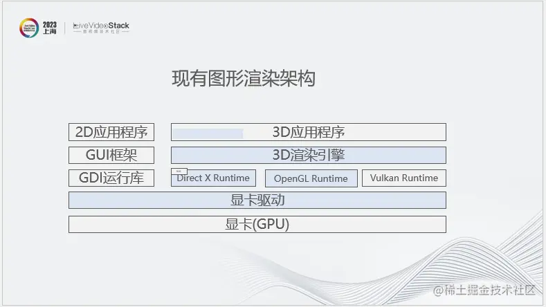 我们的现有图像渲染架构如上所示,3D技术最下层的GPU到显卡驱动、DX、OpenGL、Vulkan运行库、3D渲染引擎再到3D应用程序,直接使用底层API开发图形渲染程序难度较大。