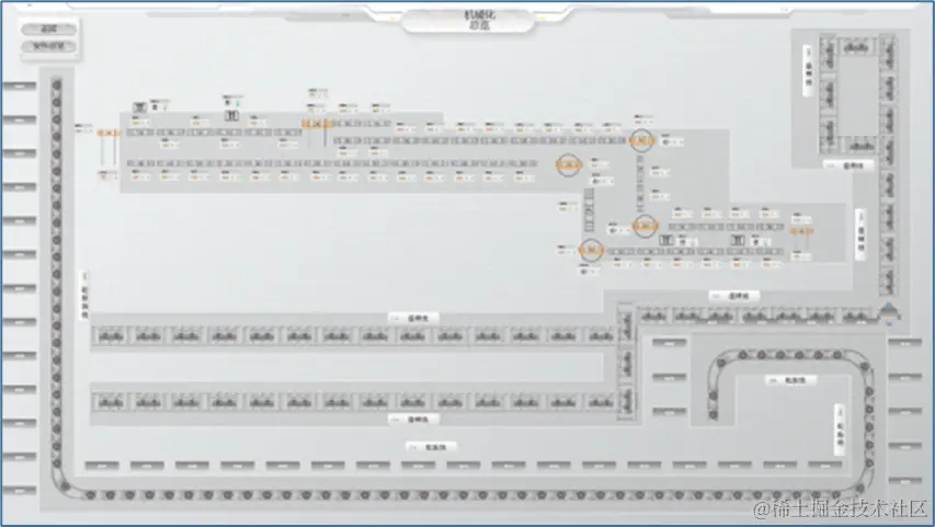 图扑物联以组态的形式展示机械化运输工艺流程,结合机运CAD布局图,将物理空间的机运工艺流程在组态中进行还原。并且分为机运总览页面和机运详情页面,以便帮助用户获取更详细的信息。展示的信息包括输送线、升降机、滑撬、移行机、转台、AGV、电机启停等设备的实时状态信息,并且组态图中的设备图标会根据设备的状态进行颜色、动画的联动。