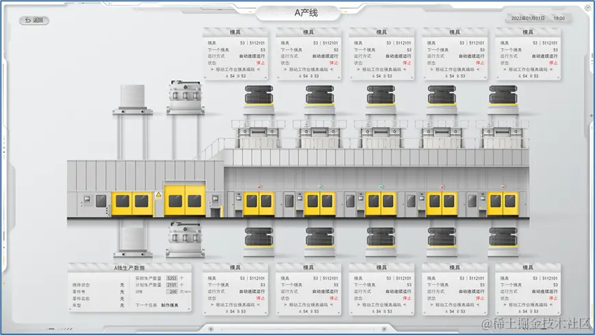 车间的生产数据、设备状况、告警状态、安东信息是车间生产管理人员需要关注的重要数据。生产数据可以帮助相关人员及时了解整车间的生产情况以便根据实际情况及时调整之后的排产计划;设备状况和设备告警状态的展示为设备管理人员及时了解所有设备的运行状况赋能,出现紧急情况时可以快速做出响应;各个工位的安东信息都可以在总览页面中进行展示,相关部门可以通过页面对出现的问题及时进行响应。