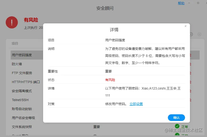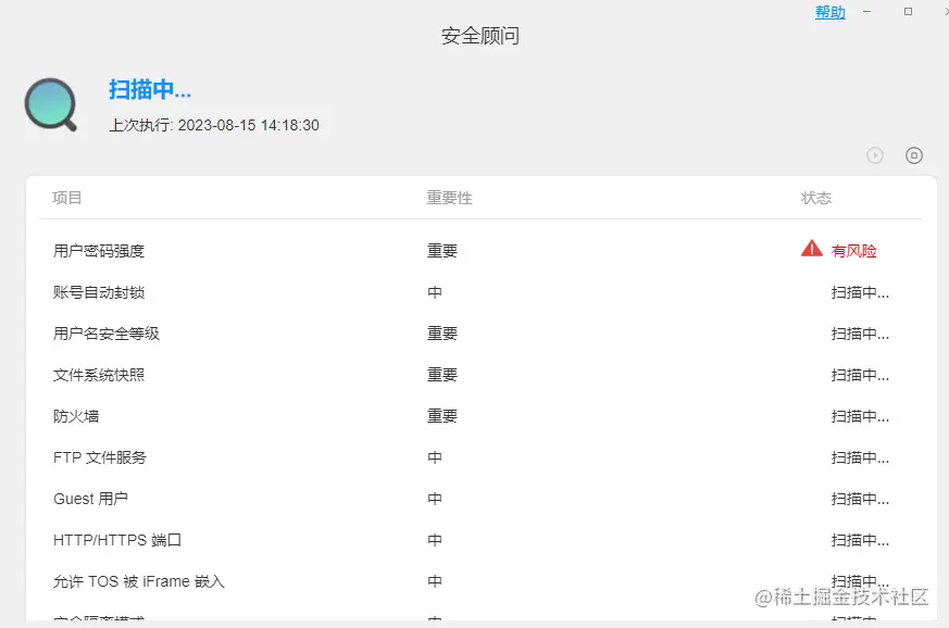 安全顾问是一款扫描系统配置的工具,启用并扫描可以执行各种检查以排查TNAS是否出现安全风险和可疑活动,用于检查您的系统设置是否安全,并提供确保系统安全的相应对策,让我们更安全地使用铁威马NAS。