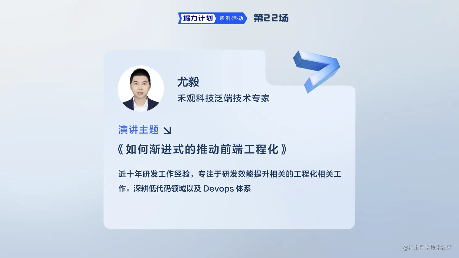 2023年8月19日,掘金掘力计划系列活动第22场——《聊聊前端工程化实践和未来》在杭州举行,在本场前端工程化专题的分享活动中,来自禾观科技的技术专家尤毅做了题为《如何渐进式的推送前端工程化》的分享。
