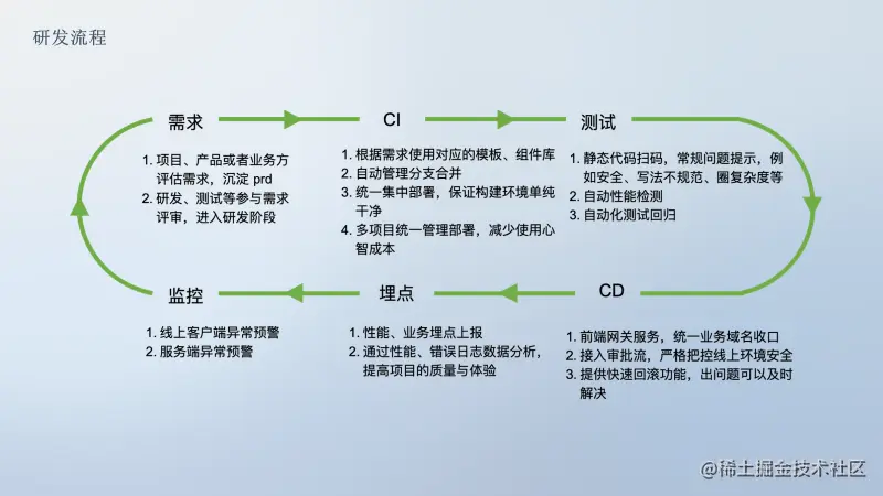 但随着前端技术的快速发展,工程化的范畴已经开始向整个产品生命周期延伸,不仅仅局限于前端UI交互的交付。可以逐步渗透至需求分析、测试以及上线后的监控等环节。这一演进的目的是为了全面优化整个产品的开发和运营过程,提高效率、降低成本,并确保产品的质量和稳定性。