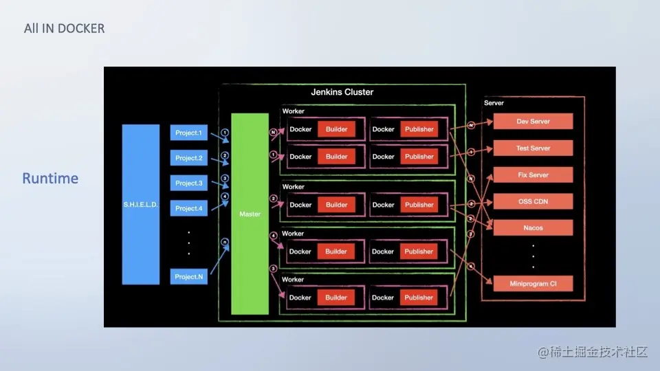 在整个需求交付的过程中,CICD 部分是最为容易作为收口的环节。使用"All in Docker"的方案可以将不同的技术类型和产物发布流程统一管理,从而更容易整合和自动化。