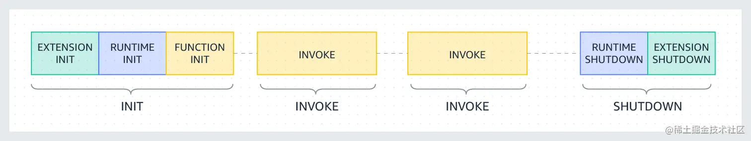 无服务器:我们不管理容器基础设施。AWS处理所有这些。 通过这种模型,Lambda可以内在地处理许多并行请求并按需扩展。我们的代码只关注业务逻辑。 接下来我们看看Lambda执行中的生命周期事件。