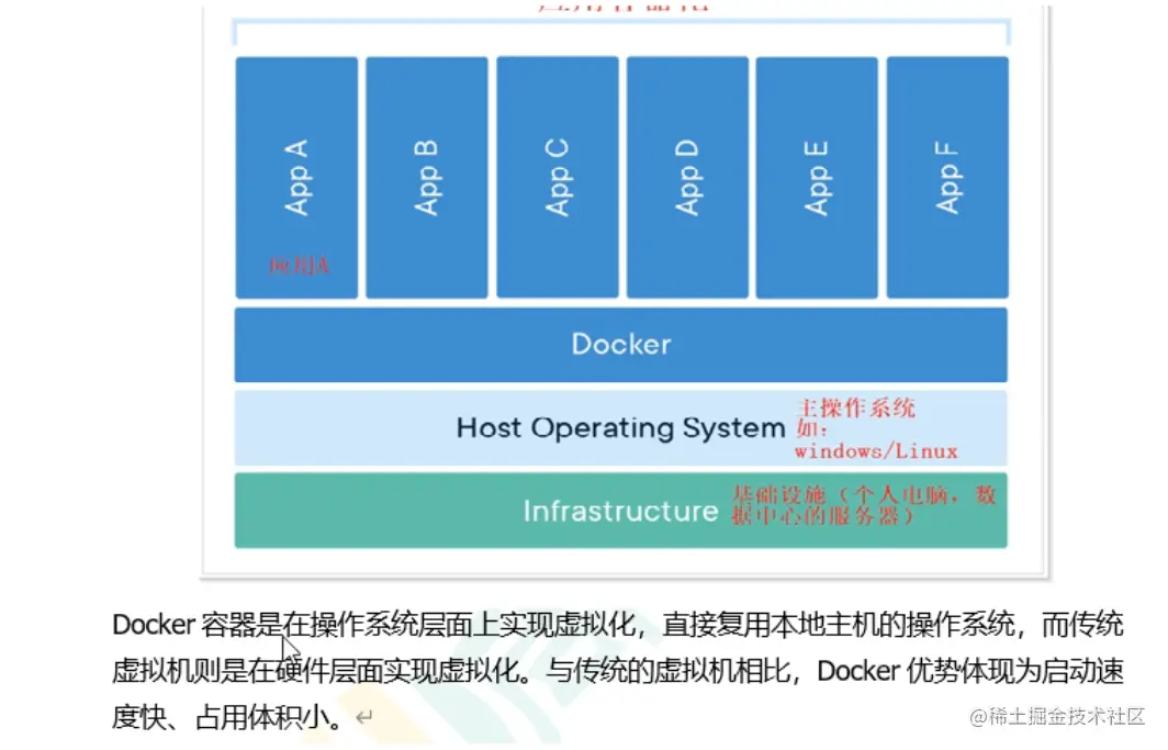 - 传统虚拟机是虚拟出一套硬件后, 在其上运行一个完整操作系统,在该系统上运行所需应用进程;