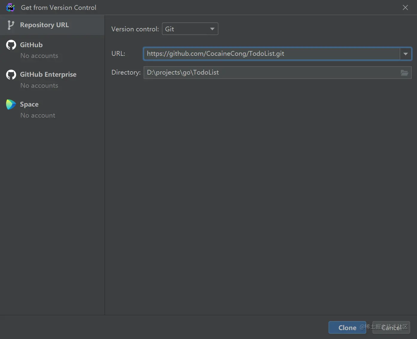 - 复制HTTPS链接到Goland的URL中,点击Clone