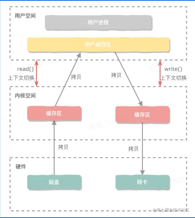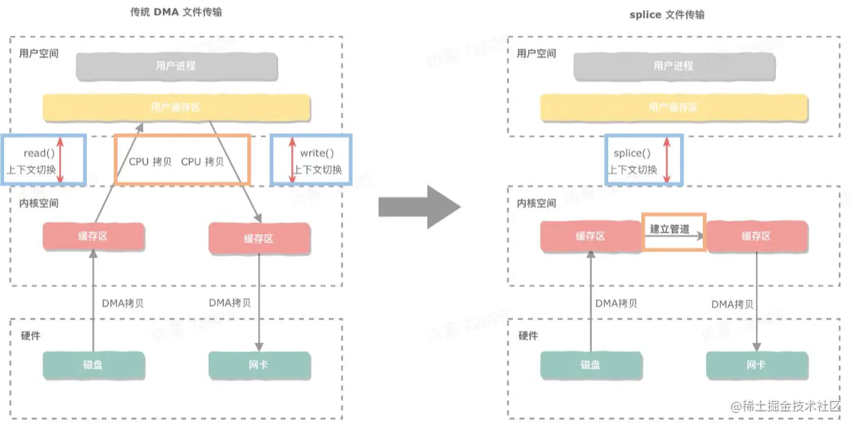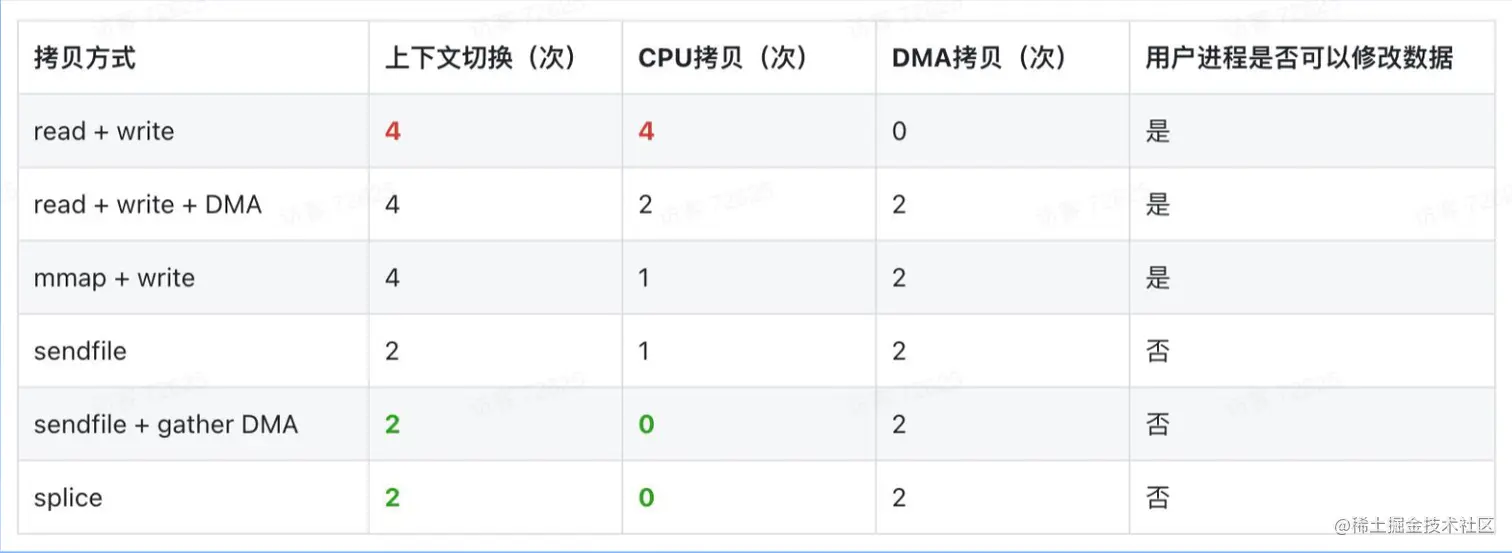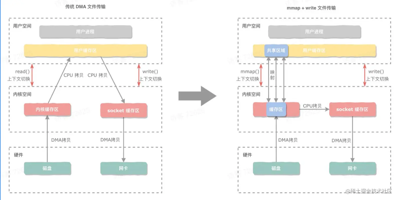 零拷贝不是0次拷贝,而是为了减少上下文切换和CPU的拷贝次数。 最原始的就是read()和write(),会占用CPU大量的时间在拷贝文件上,也会造成大量的上下文切换。 原来 8 张图,就可以搞懂「零拷贝」了 随着Linux系统的发展,系统调用的不断更新,使得零拷贝技术成为可能。