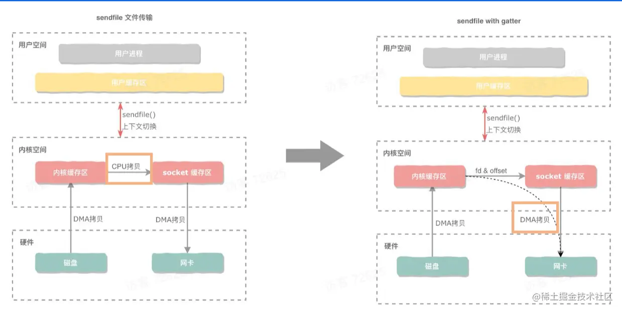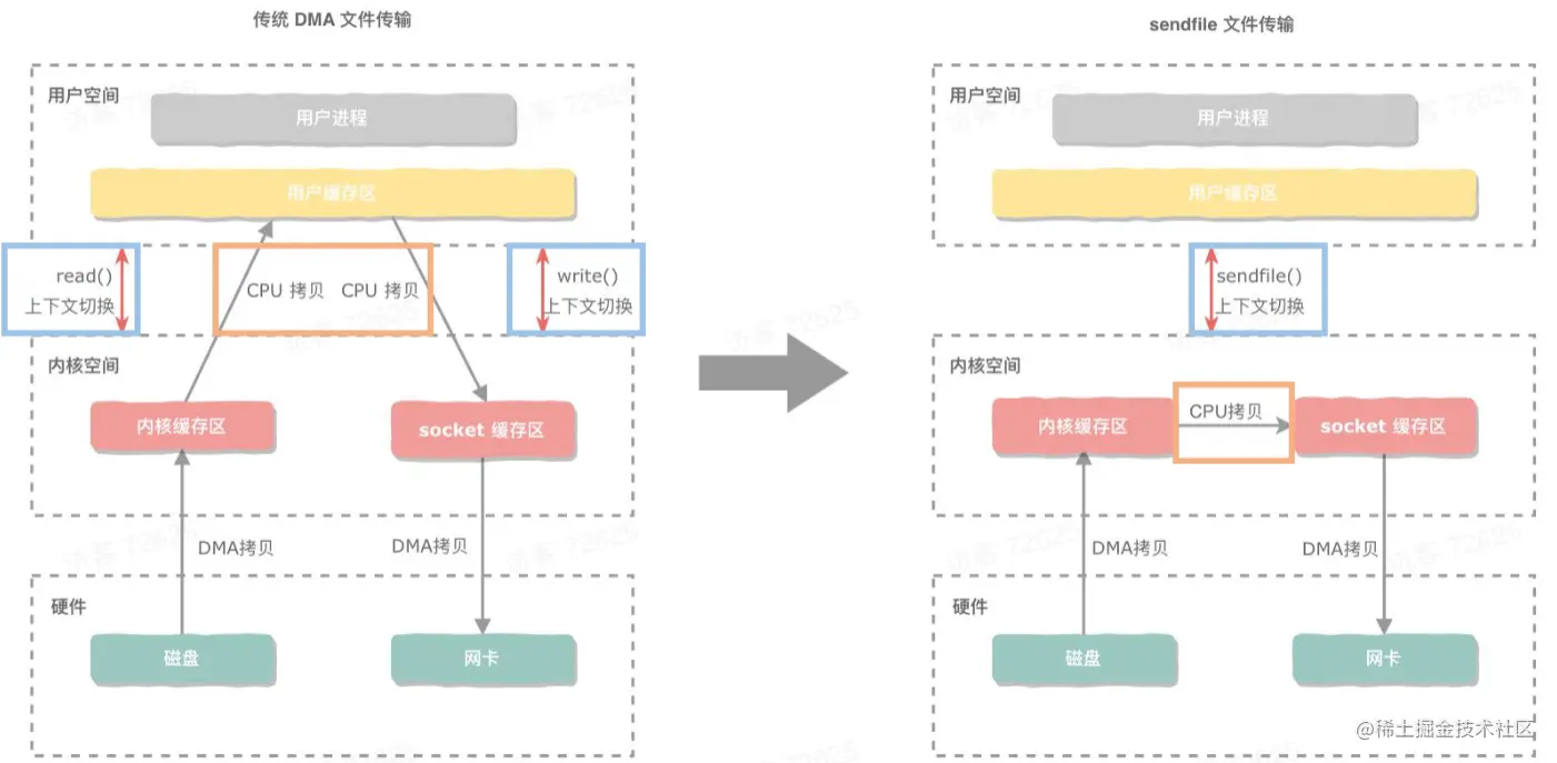 sendfile表示在两个文件描述符之间传输数据,它是在操作系统内核中操作的,避免了数据从内核缓冲区和用户缓冲区之间的拷贝操作,也减少了上下文切换。