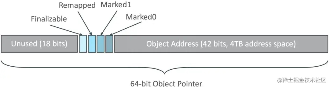 染色指针是一种直接将少量额外的信息存储在指针上的技术。目前在Linux下64位的操作系统中高18位是不能用来寻址的,但是剩余的46为却可以支持64T的空间,到目前为止我们几乎还用不到这么多内存。于是ZGC将46位中的高4位取出,用来存储4个标志位,剩余的42位可以支持4T的内存,如图所示: