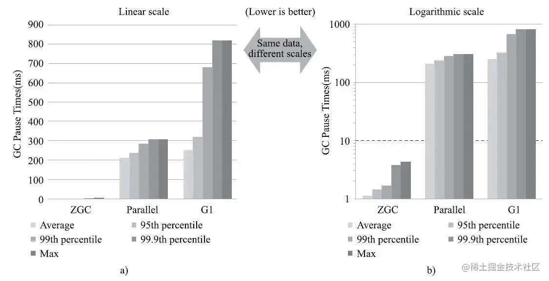 在ZGC的停顿时间测试上,和其他收集器相比完全不在一个数量级,如图: