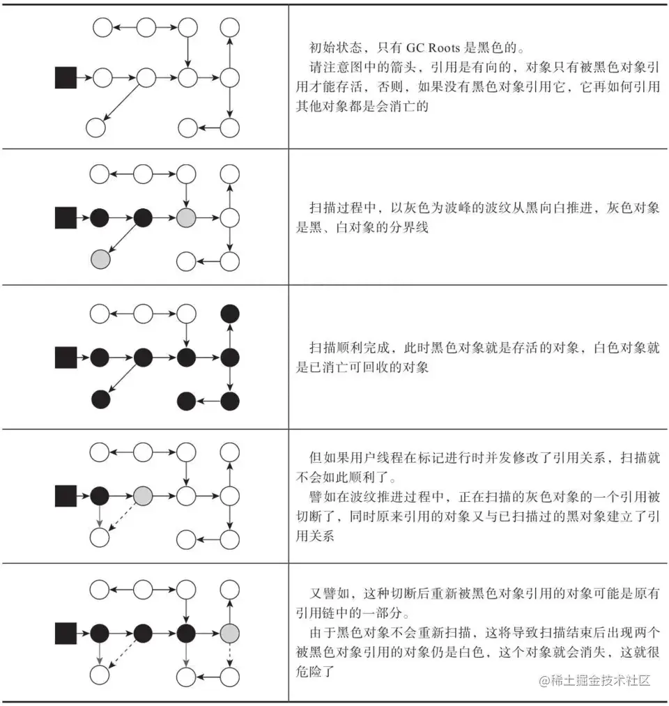 可达性分析的扫描过程,其实就是一股以灰色为波峰的波纹从黑向白推进的过程,但是在并发的推进过程中会产生“对象消失”的问题,如图: