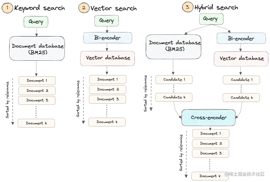 混合关键字+向量搜索:通常结合全文关键字搜索和向量搜索的候选结果,并使用交叉编码器模型重新排序它们(见下文)。需要文档数据库和向量数据库。
