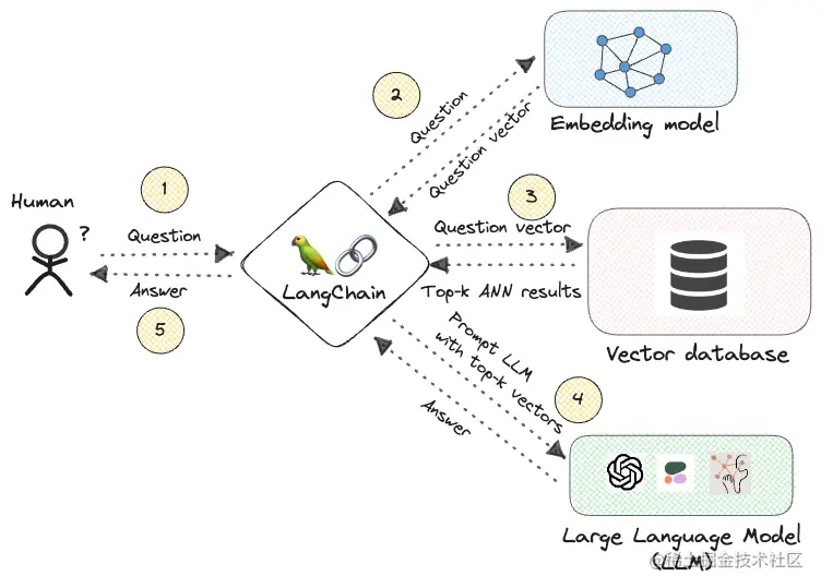 问题向量被传递给向量数据库,通过ANN搜索返回与之最相似的前k个结果。这一步非常关键,因为它大大缩小了LLM在下一步中的搜索空间。