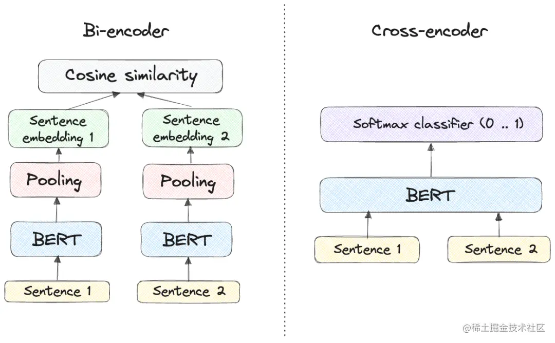 为了有效地进行混合搜索,需要通过BM25(关键字搜索)和余弦相似度(向量搜索)获得的搜索结果候选项进行组合,这需要使用交叉编码器。如下图所示,这是一个下游步骤,允许将两个句子同时传递给像BERT这样的编码器模型。与用于生成句子嵌入的双编码器不同,交叉编码器不会生成嵌入向量,而是通过softmax层为一对句子分配一个介于0和1之间的分数,从而对其进行分类。这被称为重新排序,是一种非常强大的方法,可以获得结合了关键字搜索和向量搜索优势的结果。