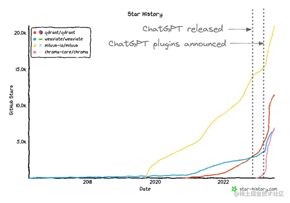 在2022年11月,OpenAI发布了ChatGPT的早期演示(它是GPT 3.5及以上版本的OpenAI接口),随后它迅速成为历史上增长最快的应用程序,在仅仅5天内就获得了一百万用户🤯!事实上,如果你查看一些主要的开源向量数据库存储库在GitHub上的历史记录,可以清楚地看到在2022年11月发布ChatGPT以及随后在2023年3月发布ChatGPT插件后,其中一些存储库的星标计数出现了明显的增长。这些因素以及它们在Hacker News和流行媒体等网站上的相关帖子,是为什么在这个领域出现了如此多的活动的重要原因之一。
