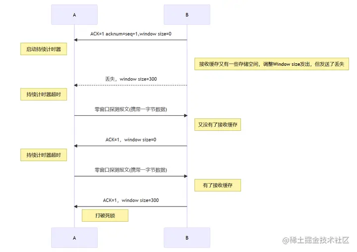 零窗口探测报文丢失是不是无法打破死锁?零窗口探测报文发送的时候也会启动重传计时器,不必担心零窗口探测报文丢失会无法打破死锁局面。