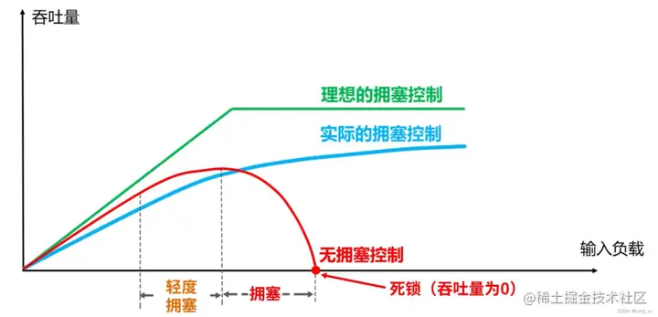 如果不对网络做拥塞控制,会降低整个网络的传输效率,直到吞吐量为0,进入死锁。
