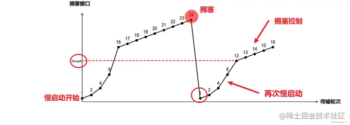 (3)window size增长到一个慢启动的阈值thresh,开始执行拥塞控制算法(window size呈线性增长),进入拥塞控制阶段。